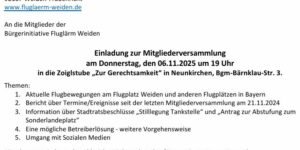am Donnerstag, den 06.11.2025 um 19 Uhr in die Zoiglstube „Zur Gerechtsamkeit“ in Neunkirchen, Bgm-Bärnklau-Str. 3. Themen: Aktuelle Flugbewegungen am Flugplatz Weiden und anderen Flugplätzen in Bayern Bericht über Termine/Ereignisse …